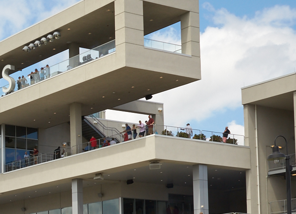Large deck on the east side of the building with views of the NYC skyline and racing action.