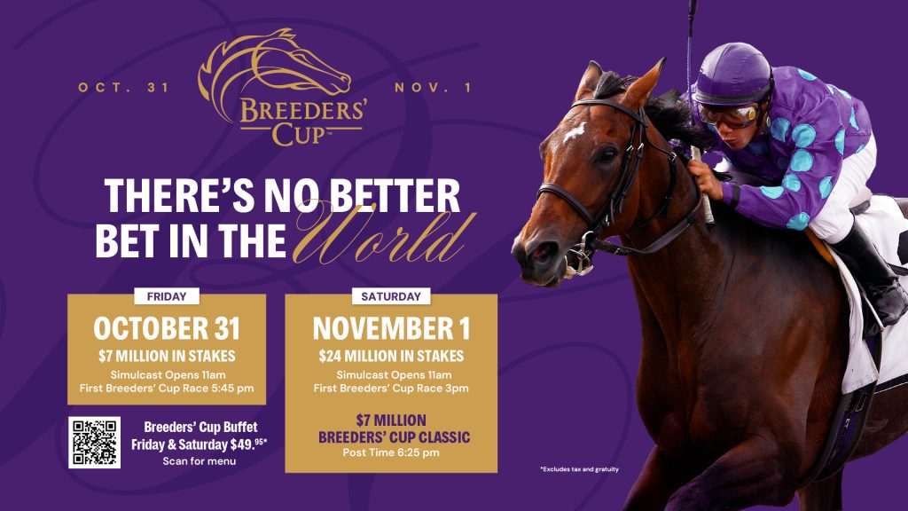 Big simulcasting weekends hit back-to-back with the Breeders’ Crown Finals from Woodbine Mohawk Park on October 24 and 25, and the Breeders’ Cup Championships from Del Mar on Friday, October 31, and Saturday, November 1. Buffet dining opens early for Breeders’ Cup weekend with doors opening at 4:30 pm and food service beginning at 5 pm. Dining reservations can be made by calling 201-The-BigM (201-843-2446). Full menus can be viewed at Playmeadowlands.com/dining.